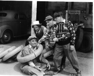 [ The worker falls backwards and knocks over a pile of tires; The Stooges take their tire and run away ]